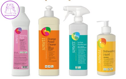 - Sonett Tekutý prostředek na nádobí a univerzální čistič: Kombinuje účinnost při mytí nádobí s možností univerzálního použití na různé povrchy.