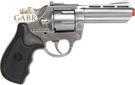 Kvalitní stříbrný policejní revolver z kovu a plastu, s bubnovým zásobníkem, na kapslíky, na 8 ran, pro všechny malé strážce zákona. Detailní zpracování.