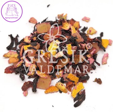 Složení: ibišek súd. květ, proslazený ananas 20 % (ananas, cukr), proslazená papája 16 % (papája, cukr), pomerančová kůra 15 %, šípek, přírodní aroma