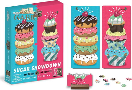 Soutěžní puzzle pro dva - to je puzzle Duel od Ridley's Games. Skládačku však může úspěšně dokončit pouze ten rychlejší z vás. Soutěží se totiž o poslední dílek, který je oboustranný a společný pro obě puzzle. Nejdříve si vyberte svůj oblíbený dezert (cupcakes nebo donuty), odstartujte závod a pusťte se do skládání. Vítězem se stává ten, kdo jako první poskládá své puzzle a vloží do něj poslední dílek. Ideální pro všechny, kteří si chtějí zaskládat i zasoutěžit.. Součástí balení jsou dvě barevné předlohy skládaného motivu a dřevěný stojánek, který drží poslední vytoužený dílek.