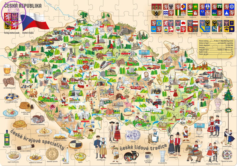 Zeměpisné puzzle pro děti s mapou České republiky a ilustracemi od výtvarníka Josefa Záruby. Na mapě najdete lidové tradice, krajové speciality, vlajku či velký státní znak a další užitečné informace. Veškeré texty na mapě jsou uvedeny v českém jazyce. Skládání barevných dílků rozvíjí u dětí postřeh, zručnost a soustředění. Obrázky představující zvířata, rostliny či budovy navíc stimulují u nejmenších dětí představivost a pomáhají jim poznávat věci charakterizující Česko.