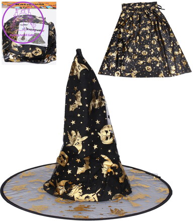 Karnevalový převlek kostým set špičatý klobouk a plášť černý + zlatý potisk.
