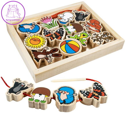 Dřevěná provlékačka Krteček pro nejmeněí děti. Součástí 12 navlékacích dílků a provázek s dřevěnou jehlou. Baleno v dřevěné krabici.