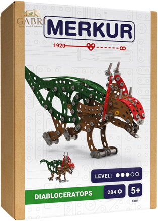 Kovový model pravěký ještěr Diabloceratops z kolekce dinosaurů obsahuje součástky nutné pro sestavení tohoto modelu. V balení najdete podrobný návod, Merkur sadu nářadí a unikátní Merkur díly. Merkur díly jsou univerzální a tak vás neomezí v jakékoli modifikaci a nápadu. Stavebnici tak můžete sestavit podle přiloženého návodu nebo čistě podle svých představ. Se sestavenými modely si lze hrát, jsou velmi odolné. Podporuje a rozvíjí manuálních schopnosti, logické myšlení, soustředění.