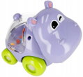 Chrastítko autíčko, ve tvaru půvabného hrošíka, s rotujícími kuličkami v bříšku, potěší nejedno miminko. Zvířátko s kuličkami poskytuje spoustu zábavy, motivuje dítě k samostatným pokusům o plazení nebo chůzi. Hračka při pohybu vydává chrastivé zvuky díky barevným kuličkám umístěným v bříšku zvířátka. Rotující barevné kuličky poskytují vizuální podněty a podporují rozvoj zraku a vnímání miminka. Zaoblený tvar usnadňuje uchopení hračky a kolečka umožňují snadné uvedení hračky do pohybu zatlačením.