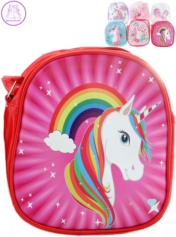 Lesklá plastová dětská kabelka s jednorožcem, jedna komora, zapínání na zip, nastavitelný popruh, 6 variant provedení, velikost: 17 x 20cm. Baleno v sáčku.