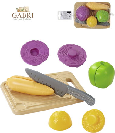 Plastová sada zeleniny na krájení. Jídlo lze krájet (oddělovat) opakovaně. Jednotlivé dílky je možné jednoduše "krájet" přiloženým nožíkem. Poloviny, rozpůlené potraviny. Součástí balení je plastový nožík a prkénko na krájení.