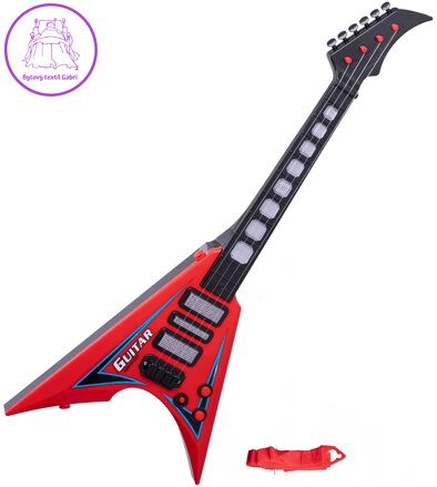 Červená dětská rocková elektrická kytara s popruhem, pro všechny malé rockery a muzikanty. Velikost 58cm. Zvukové a světelné efekty. Hračka na baterie, se světlem a zvukem.