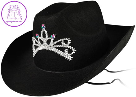 Černý dámský kovbojský klobouk s korunkou, o velikosti 30 x 38cm. Vhodné jako doplněk ke kostýmu, na karneval.