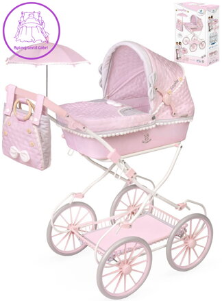 DeCuevas 81075 Skládací kočárek pro panenky s taškou a doplňky Sophie 2025 - 81 cm ze stejnojmenné kolekce, která je novinkou roku 2025, je díky vysoké rukojeti spíš vhodný pro větší slečny. Něžná dívčí kolekce Sophie je nepřehlédnutelná pro každé děvčátko. Světle růžová barva dominuje celé kolekci. Doplněná je o světle šedivé a bílé kraječky a mašličky, které zdobí všechny výrobky této rozmanité kolekce a ještě více podtrhují nádech romantiky. Kolekce nabízí nejen zmíněné kočárky, ale i jiné doplňky pro malé slečny a jejich panenky. Jeho designové zpracování ho řadí mezi kočárky zakoupené i pro sběratelské účely. Nádherný španělský design, precizní zpracování. Skládací model, velmi snadná manipulace během samotné hry. Materiál: kov, plast, textil. Baleno v krabici v barvách kolekce.