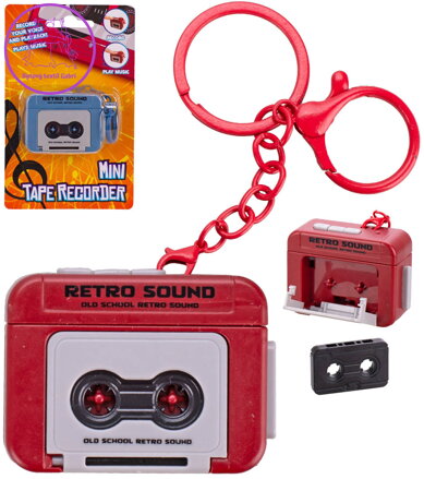 Mini přívěsek na klíče ve tvaru retro kazetového magnetofonu. Vyroben z plastu o velikosti přibližně 5,5 cm. Umí nahrávat a přehrávat zvuk a je vybaven kroužkem na klíče.