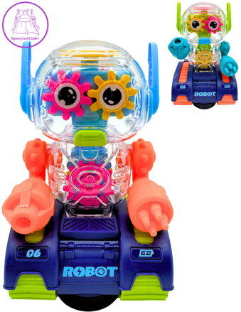 Robot se světelným a zvukovým efektem je interaktivní hračka určená pro děti od tří let, která podporuje kreativitu a rozvíjí fantazii. Robot vyniká svým zábavným designem, kdy průhledná plastová hlava odhaluje barevná ozubená kolečka, která se při zapnutí otáčejí a vytvářejí tak zajímavý vizuální efekt. Dvě barevné varianty robota – oranžovo-modrá a zeleno-modro-fialová – nabízí dětem možnost výběru podle jejich oblíbených barev.
