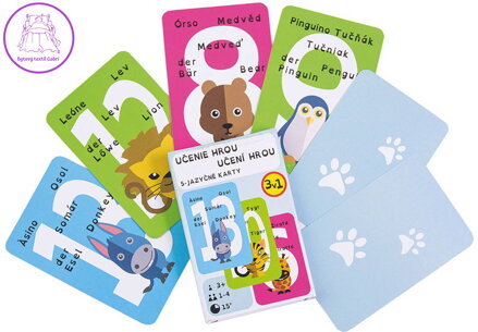 Zábava, smích a učení v jednom balení. Tyto edukativní hrací karty 3 v 1 přinášejí dětem oblíbené hry v nové, chytřejší podobě. Děti se při hraní nenápadně učí základy až tří světových jazyků – hravou formou, která je baví. Každá karta obsahuje barevný obrázek a název ve čtyřech jazycích: slovensky, česky, německy a anglicky. Díky tomu si děti přirozeně rozšiřují slovní zásobu už od útlého věku.