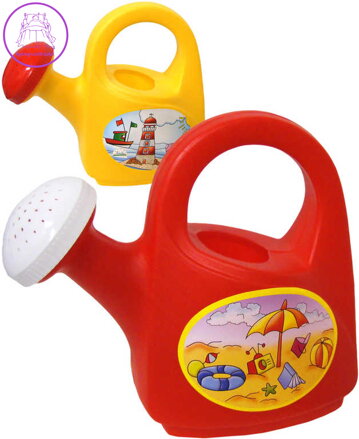 Plastová zahradní konev s růžicí z plastu pro děti - malé zahradníky, na zalévání na zahrádku, ve třech barevných variantách, s obrázkem (pláž, maják a další)