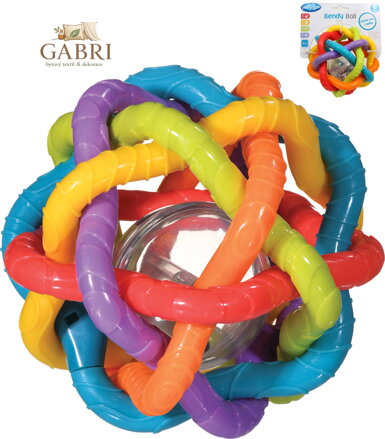 Barevný míček, který budou děti milovat. Vyroben je ze zdravotně nezávadného materiálu. Různé struktury podporují rozvoj hmatu. Míček není celistvý, takže ho dítě může vzít do ruky a nebo i kousat. Uvnitř ukrytá kulička vydává rachtavé zvuky.
