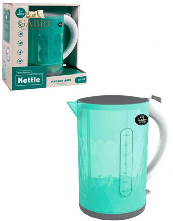 Pěkný funkční model dětské rychlovarné konvice, v moderním designu, s reálnými funkcemi a zvuky, pro všechny malé maminky a pomocnice v domácnosti. Zvuk vařící vody. Funkční tlačítko pro otevření i zapnutí