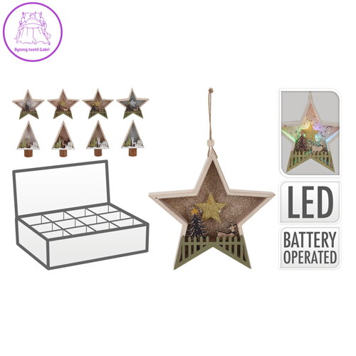 Drevená svietiaca LED dekorácia – mix farieb/farebné LED osvetlenie. Napájanie na batérie – 3x LR44 sú súčasťou balenia. Materiál: drevo. Dizajn: hviezda a strom. Strom výška 23 cm, Hviezda výška 19,5 cm.