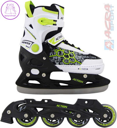 Přiložené dva podvozky umožňují univerzálně měnit kolečkové brusle se zimními pruslemi - měkká šněrovací bota s přezkou a stahovacím páskem na suchý zip, vnitřní výplň s "pamětí", ložiska ABEC - 5, zpevněný plastový podvozek, PU vrstvená kolečka 64 x 24 mm v transparentní barvě.