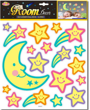 Fosforeskující objekty z oblohy, jsou určeny pro hladké plochy (stěny, dveře, skříně). Po zhasnutí ve tmě jemně září. Dětské fosforeskující tvary jako jsou hvězdy, slunce, měsíc - ve tmě svítí, navozují